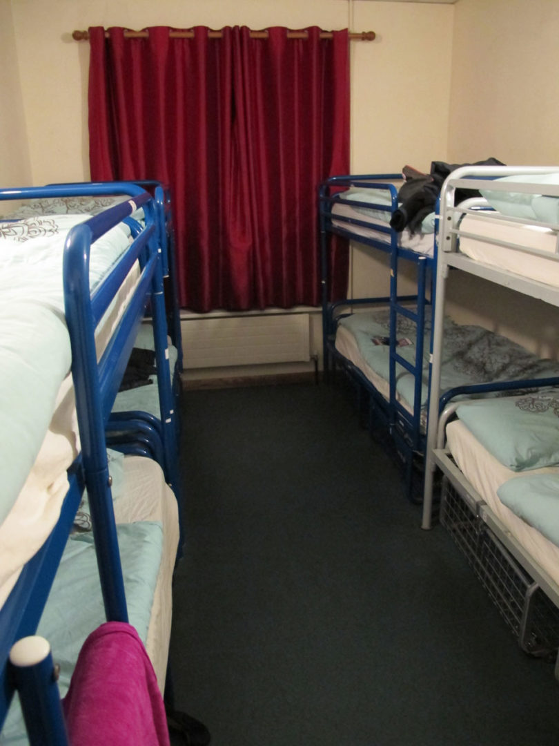 Fiquei num quarto pra 8 feminino com banheiro. O colchão era confortável, o edredom fofinho e o banheiro bem tranks, apesar de pequeno. Só achei ruim porque não tinha muito lugar pra pendurar coisas nem muitas tomadas no quarto. Ah, e embaixo das camas tem uns gavetões de metal que servem de locker pra você botar a mala e tal, mas é preciso levar um cadeado pra fechá-los (ou comprar um na recepção, por algum valor abusivo que não cheguei a perguntar).